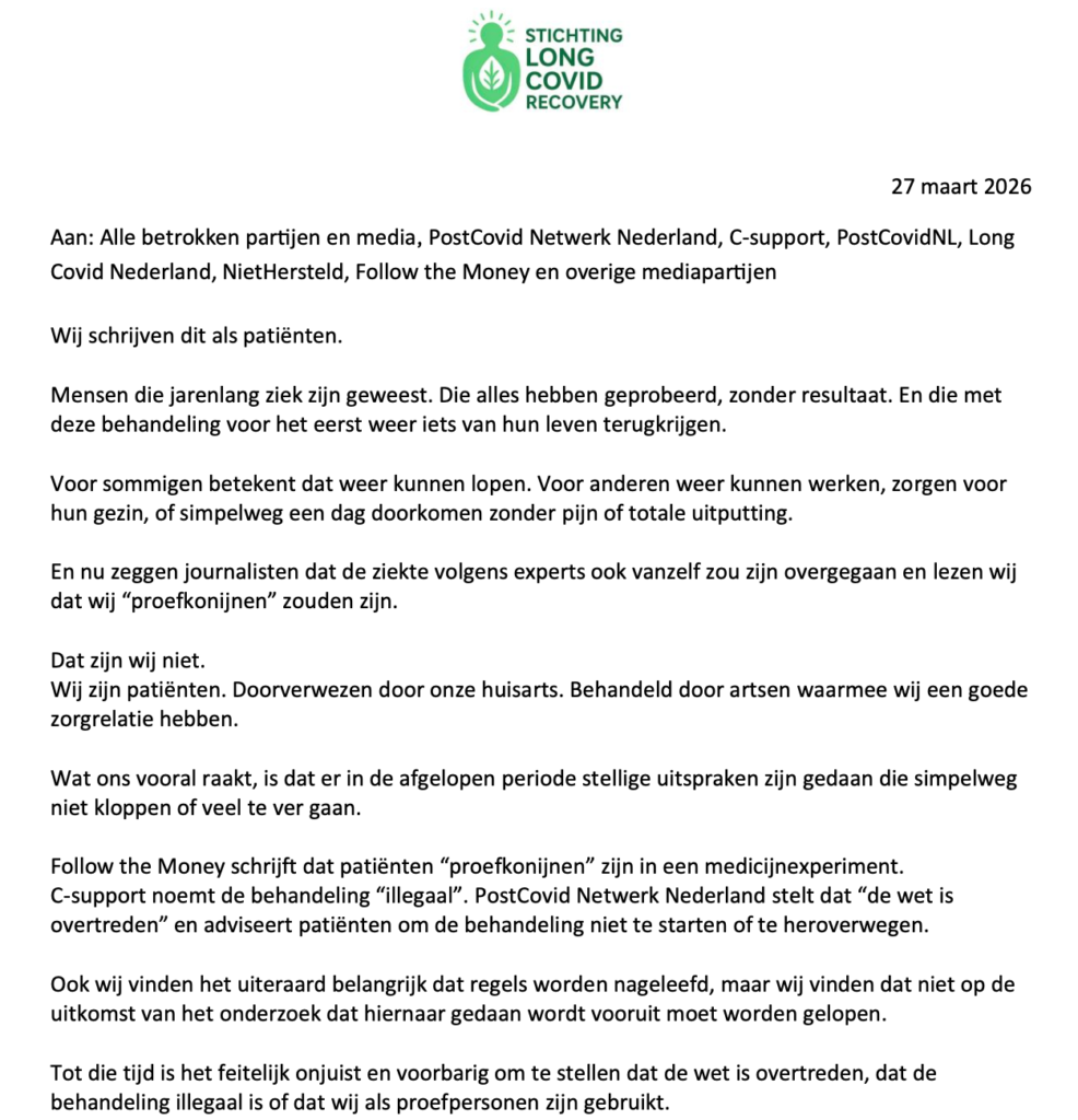 Ik hoop dat het middel vergoed gaat worden zodat Arjen de Lidocaïne behandeling weer kan oppakken bij een terugval. Ik hoop ook dat dit middel voor alle 450.000 Long Covid patiënten maar in ieder geval voor de 90.000 patiënten met ernstige klachten beschikbaar komt. Dat is mijn wens voor 2026!